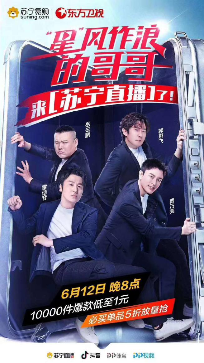 原來,蘇寧將在6月12日晚8點開啟以“星”風作浪的哥哥為主題的直播活動,共計3個小時。正所謂娛樂購物兩不誤,極限挑戰(zhàn)將陣容搬到了直播間,4位明星搭檔主持,帶領用戶感受全方位的品質化購物,煥新精彩生活。