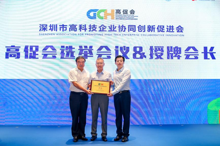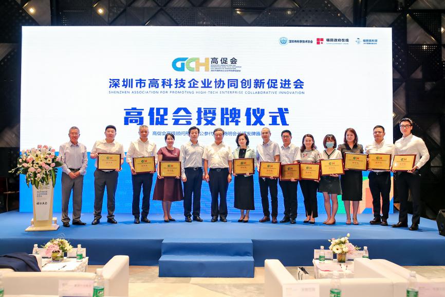 高促會(huì)會(huì)長(zhǎng)靳曉明因北京疫情原因無法來到現(xiàn)場(chǎng),由高促會(huì)高級(jí)顧問邢繼俊代表靳會(huì)長(zhǎng)接受由榮譽(yù)會(huì)長(zhǎng)馬蔚華和福田區(qū)科技創(chuàng)新局局長(zhǎng)張忠暉頒發(fā)的高促會(huì)會(huì)長(zhǎng)牌匾。