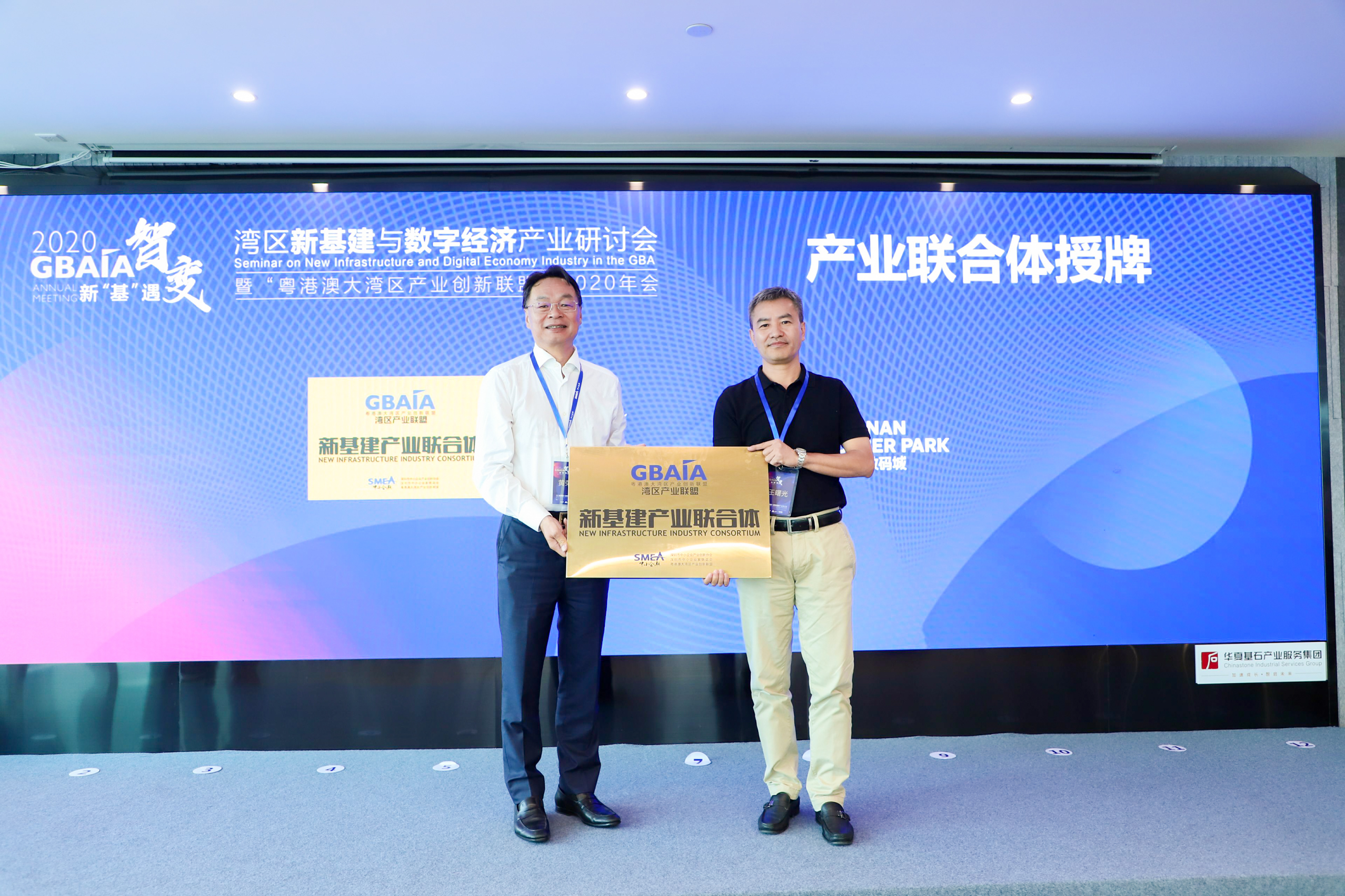 “灣區(qū)峰會(huì)”組委會(huì)主席/深圳市中小企業(yè)產(chǎn)業(yè)創(chuàng)新協(xié)會(huì)會(huì)長/銀盛集團(tuán)董事局主席林重成與天安數(shù)碼集團(tuán)董事/常務(wù)副總裁鄭洪權(quán)為專家評(píng)審團(tuán)授牌