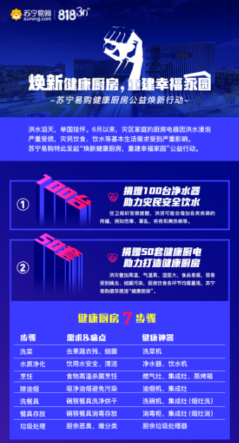 與此同時(shí),洪水致使大批廚房電器受損,疊加高溫天氣,災(zāi)民飲食安全面臨考驗(yàn)。蘇寧易購(gòu)特別捐贈(zèng)50套健康廚電,涵蓋油煙機(jī)、灶具、消毒柜等必備廚房電器,讓災(zāi)民更快恢復(fù)健康生活。同時(shí),廚房作為“病從口入”最關(guān)鍵的環(huán)節(jié),洗菜、水質(zhì)凈化、烹飪除油煙、餐具清潔消毒、廚余垃圾處理等每一環(huán)都不容忽視,蘇寧易購(gòu)特別倡導(dǎo)“健康廚房7步驟”,全流程打造健康廚房,并借助蘇寧易購(gòu)雙線渠道全面開(kāi)展科普活動(dòng)。
