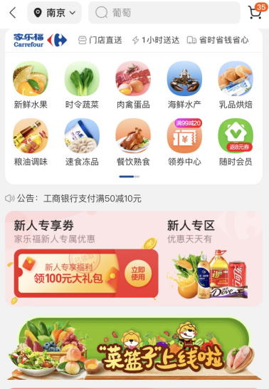 自8月8日起,消費者通過蘇寧易購 APP、家樂福微信小程序等平臺,可以一鍵購買米面糧油、乳品烘焙、水產(chǎn)肉類、蔬菜水果等食物,SKU超過700個。很快,菜籃子也將在蘇寧小店APP上線。門店三公里范圍內(nèi)的訂單,最快25分鐘便可送到家。目前,菜籃子已經(jīng)覆蓋了51座城市的215家家樂福門店。