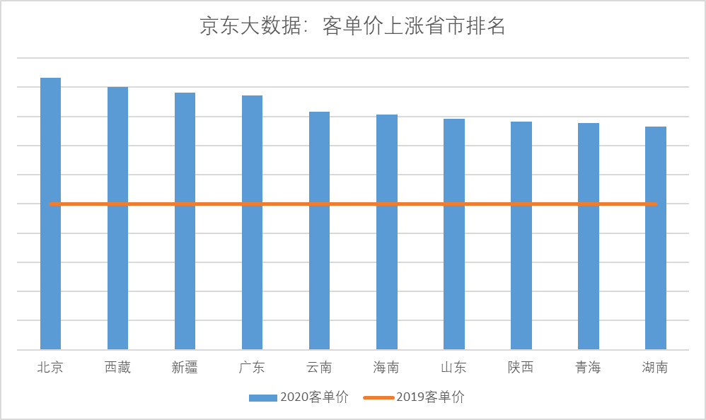 但是,消費者采購月餅時卻呈現出更積極的上升趨勢:據京東大數據,今年京東平臺上不但用戶數大幅增加,其中相當大部分新用戶來自低線市場用戶,而且消費者相比去年更加追求品質,大品牌、高規(guī)格的月餅禮盒熱銷,因此月餅平均客單價比去年上漲了35%以上。下圖可見,除北京廣東等發(fā)達地區(qū)外,客單價上漲的主要動力來自于西北、西南和華中等地區(qū)。