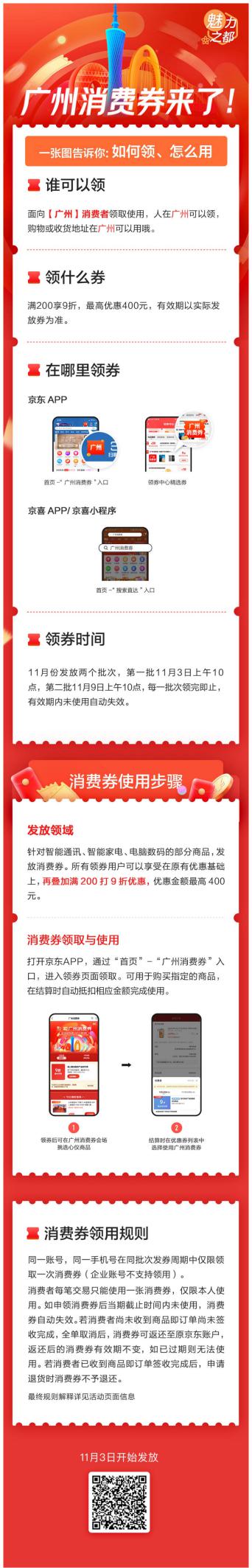 廣州消費券將發(fā)放兩個批次,第一批于11月3日上午10點發(fā)放,第二批于11月9日上午10點發(fā)放,領完即止。廣州消費券針對手機通訊、智能家電、電腦數(shù)碼等領域的熱銷產(chǎn)品,有效期6天。
