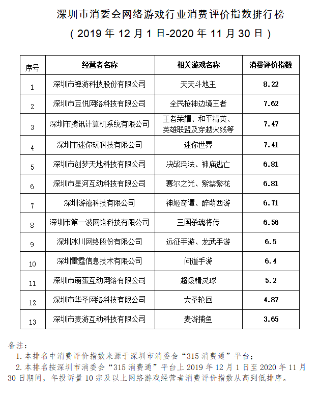 為推進(jìn)網(wǎng)絡(luò)游戲消費(fèi)者權(quán)益保護(hù)工作,促進(jìn)網(wǎng)絡(luò)游戲行業(yè)規(guī)范發(fā)展,引導(dǎo)放心消費(fèi),深圳市消委會依據(jù)2019年12月1日至2020年11月30日期間的相關(guān)數(shù)據(jù),對注冊所在地為深圳的年投訴量10宗及以上的13家網(wǎng)絡(luò)游戲經(jīng)營者進(jìn)行消費(fèi)評價指數(shù)排名。