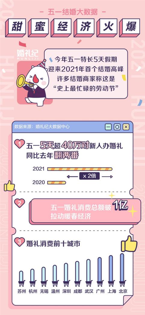 數(shù)據(jù)顯示,五一迎來2021年首個結(jié)婚高峰,5天內(nèi)超40萬對新人舉辦婚禮,同比去年翻兩番。五一婚禮消費總額破1億,在一定程度上拉動暖春經(jīng)濟。婚禮消費前十城市分別是北京、上海、廣州、武漢、成都、深圳、溫州、無錫、杭州、蘇州。