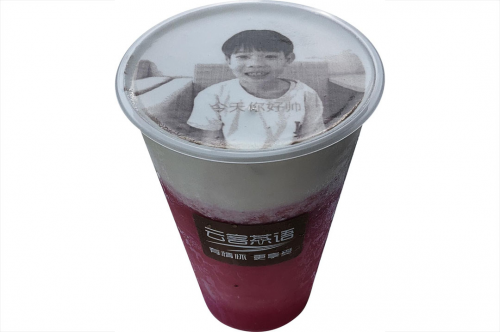 建議由孩子把自己或家人的照片加上一句話祝愿的話,作成圖片先保存到手機里。到店后,在云客茶語小程序上傳打印到奶茶上。整個制作過程約10分鐘。