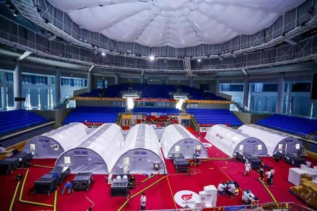 從5月27號凌晨5時物料進入場館開始,華大團隊在深圳市衛(wèi)健委、鹽田區(qū)衛(wèi)健局、深圳鹽田區(qū)供電局、鹽田體育中心等各部門單位的大力支持和協(xié)調(diào)下,6小時內(nèi)快速搭建起2套、6個艙體的快裝式負壓硬氣膜核酸檢測實驗室(以下簡稱"硬氣膜實驗室"),隨即,鹽田區(qū)搭載了華大智造自動化設(shè)備的"火眼實驗室"投入試運行,并在9小時內(nèi)通過專家組評審。