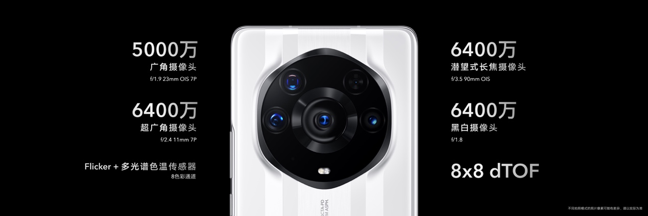影像方面,榮耀Magic3至臻版打破手機鏡頭天花板,突破性地采用了多主攝設計。在與榮耀 Magic3 Pro采用同樣的業(yè)界領先6400萬潛望式長焦鏡頭和6400萬黑白鏡頭基礎上,榮耀 Magic3至臻版將5000萬像素超大底主攝升級為索尼 IMX700,傳感器尺寸達到1/1.28英寸,擁有業(yè)界領先的感光度(ISO),成像解析力、暗光拍攝能力更強。而超廣角微距鏡頭,也從1300萬像素,升級為業(yè)界領先的6400萬像素126°超大廣角微距鏡頭,能完美呈現廣闊空間中整個建筑、地標,亦能捕捉2.5cm近距離下的微小細節(jié),提供肉眼無法看到的創(chuàng)意視角。多主攝計算攝影,實現多焦段高清影像。
