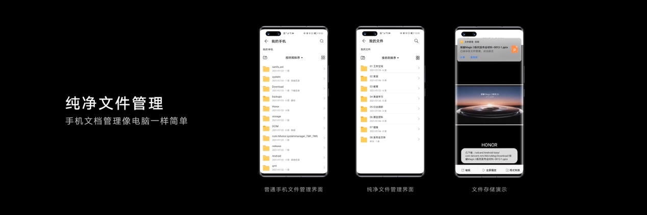 為了幫助事務繁多的商務人士更高效管理個人事務,榮耀還與各辦公平臺合作,讓用戶在釘釘、飛書、Welink、WPS辦公平臺的日程均能通過榮耀Magic3系列進行統(tǒng)一管理。而新增的純凈文件管理系統(tǒng)(此功能后續(xù)通過 OTA升級支持),則使榮耀Magic3系列在文件保存和管理方面進行進一步簡化,讓手機文件管理從此可以像電腦一樣簡單便捷。