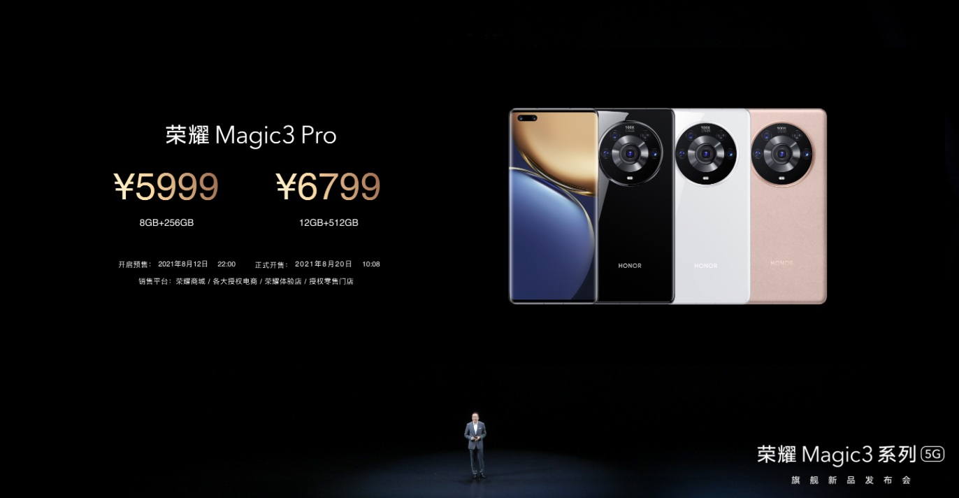 榮耀 M agic38GB+128GB版售價4599元,8GB+256GB版售價4999元;榮耀Magic3 Pro8GB+256GB版售價5999元,12GB+512GB版售價6799元;榮耀Magic3至臻版12GB+512GB售價7999元。8月12日22:00榮耀 Magic3系列手機正式開啟預售,8月20日10點08分,榮耀 M agic3系列手機將于榮耀商城、各大授權電商、榮耀體驗店、榮耀零售門店等全平臺開售。