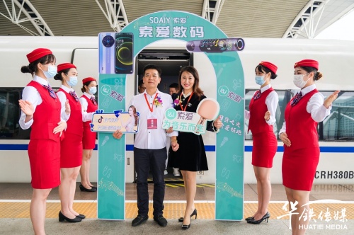10月28日上午,索愛集團(tuán)董事長(zhǎng)劉建佳、總經(jīng)理全雪梅、華鐵傳媒集團(tuán)廣州分公司銷售總經(jīng)理劉延群等領(lǐng)導(dǎo)嘉賓共同為冠名發(fā)車儀式揭幕、剪彩、互贈(zèng)紀(jì)念禮品,在現(xiàn)場(chǎng)嘉賓的共同見證下,張貼索愛全新品牌代言人陳小春夫婦形象宣傳海報(bào)的“索愛-為音樂而生”高鐵冠名列車正式啟程。