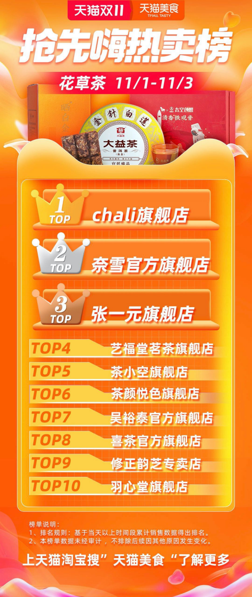今年“雙11”電商購物節(jié)比往年更早開啟,10月20日晚8點便拉開序幕,奈雪的茶隨之推出滿減、秒殺等多項優(yōu)惠活動。奈雪此次雙11迎來開門紅,數(shù)據(jù)顯示,11月1日凌晨開售后僅10分鐘,奈雪的茶的銷售總額便突破去年全天。11月1日-3日,伴隨著茶禮盒等產(chǎn)品的熱銷,奈雪躋身花草茶銷售額排行榜TOP2。