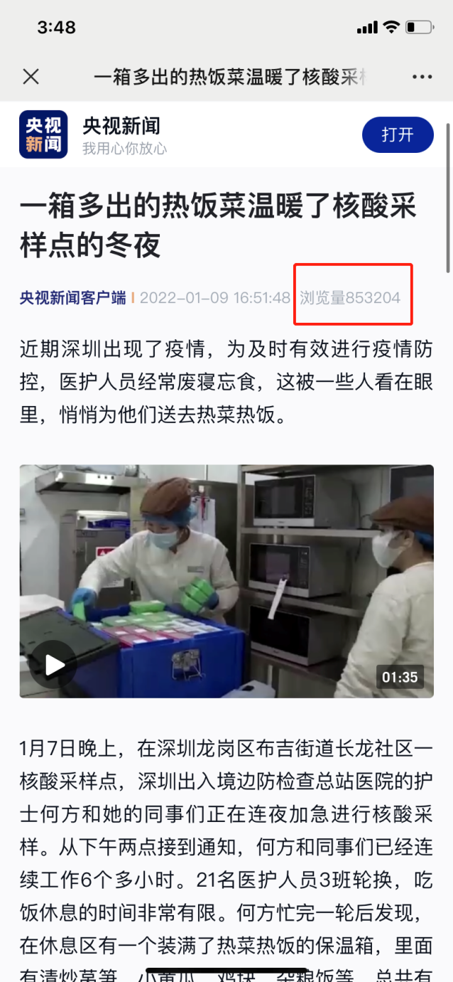1月9日,一篇名為《一箱多出的熱飯菜溫暖了核酸采樣點(diǎn)的冬夜》的報(bào)道登上了央視新聞。在深圳全民抗疫期間,“維小飯”為核酸檢測(cè)醫(yī)護(hù)人員偷偷送上用保溫箱裝好的熱飯熱菜,獲網(wǎng)友紛紛點(diǎn)贊:你永遠(yuǎn)可以相信“深圳速度”,也永遠(yuǎn)可以相信“深圳創(chuàng)新”。央視新聞報(bào)道之后,熱度持續(xù)不減。“深廣電第一現(xiàn)場(chǎng)”“羊城晚報(bào)”“光明網(wǎng)”“中國青年網(wǎng)”等權(quán)威媒體也將此事件進(jìn)行了報(bào)道,引發(fā)眾網(wǎng)友熱議。