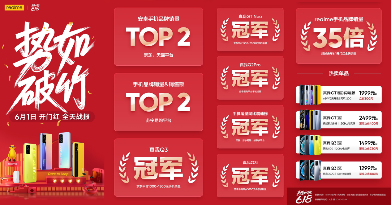 智能手機(jī)品牌realme真我公布618開門紅首日戰(zhàn)報(bào):realme真我斬獲京東、天貓平臺(tái)安卓手機(jī)品牌銷量TOP2,蘇寧易購手機(jī)品牌銷量&銷售額TOP2,成為天貓、蘇寧易購、拼多多平臺(tái)手機(jī)銷量同比增速榜冠軍,手機(jī)品牌銷量超過去年開門紅全天銷量35倍,創(chuàng)下品牌618開門紅歷史最佳成績!