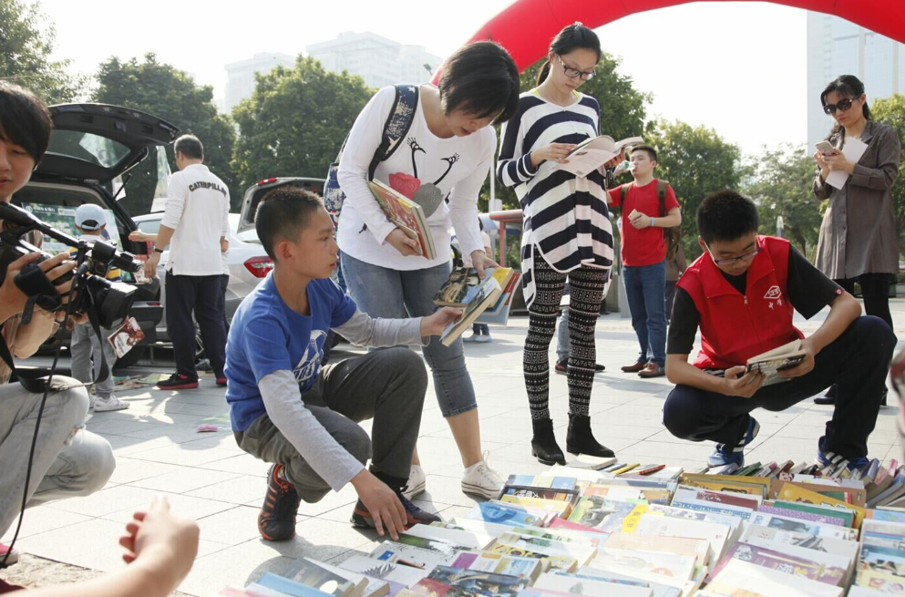 深圳市實驗中學(xué)的車尾箱展位前圍滿了前來換書的人