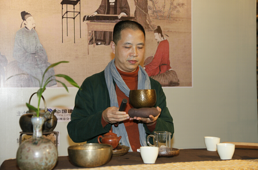 周三茶會的經(jīng)行禪茶創(chuàng)始人汪林生在進(jìn)行禪茶表演