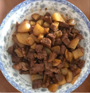 我們準(zhǔn)備好食材:梅頭肉、土豆、生抽和老抽、姜、少量白砂糖和油。媽媽把梅頭肉在水里煮了一下。這個(gè)時(shí)候,我也沒閑著,我拿出幾個(gè)土豆,洗好,再用刨子小心翼翼地把皮削干凈。我和媽媽一起把梅頭肉和土豆切塊,把姜切細(xì),就準(zhǔn)備下鍋了。媽媽先倒一點(diǎn)油到鍋里,鍋熱后把姜放進(jìn)去。接下來(lái)是切好的梅頭肉,將肉燒的泛黃后倒入土豆,然后是生抽和老抽各一小勺,還要放入少量的白砂糖,最后用水剛好沒過(guò)食材。先大火后中火再轉(zhuǎn)小火燜大約三十分鐘,收汁,出鍋!