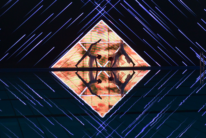 啟動儀式在數(shù)字舞美《極魅之光》中開啟,作為首次在游泳館內(nèi)舉行的開幕式,平靜的水面倒映著變幻的光影和舞姿,精彩的表演贏得了現(xiàn)場觀眾的熱烈掌聲。