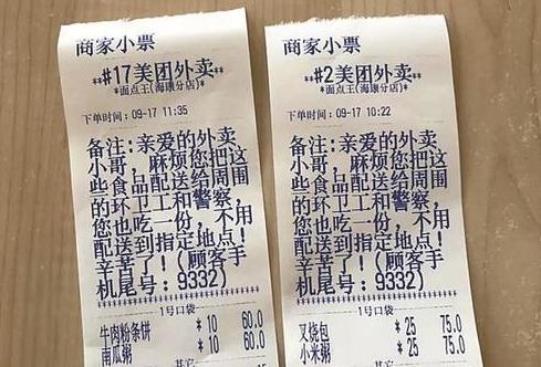 愛心外賣訂單顯示,該訂單沒有收件人及地址。但下單人何女士留言備注稱,“親愛的外賣小哥,麻煩您把這些食品配送給周圍的環(huán)衛(wèi)工和警察,您也吃一份,不用配送到指定地點(diǎn)!辛苦了!”