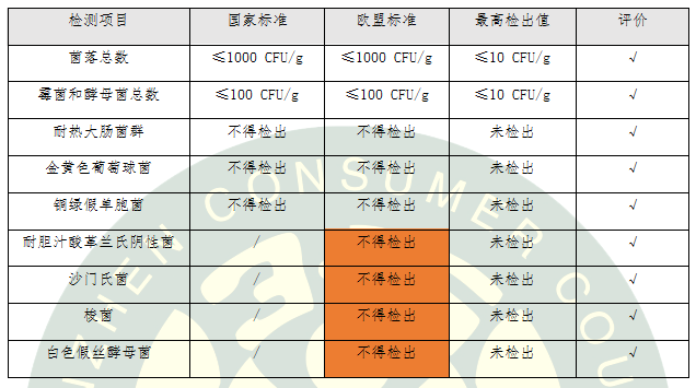 歐盟對化妝品中微生物要求更加嚴(yán)格,國標(biāo)要求5項,歐標(biāo)要求9項。檢測結(jié)果顯示:8款氣墊粉底微生物檢測結(jié)果不僅符合國家標(biāo)準(zhǔn)要求,而且符合歐盟法規(guī)要求。