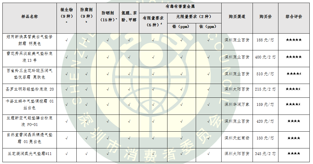 為給消費者提供科學(xué)合理的消費指引,深圳市消費者委員會聯(lián)合福田區(qū)消費者委員會、寶安區(qū)消費者委員會委托深圳市品質(zhì)消費研究院開展氣墊粉底比較試驗。本次比較試驗委托第三方權(quán)威檢測機構(gòu)進行檢測,對國內(nèi)外8個知名品牌氣墊粉底的安全性和感官性進行了比拼。
