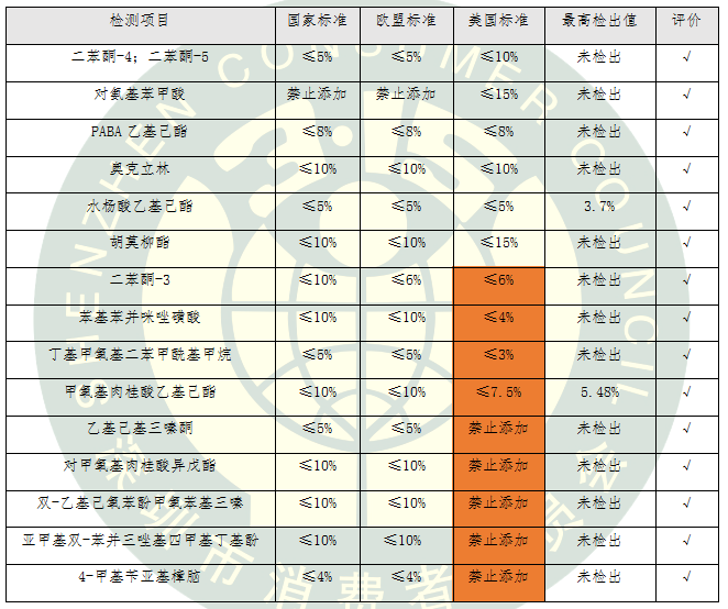 防曬化妝品在美國按非處方藥(OTC)管理,新的防曬劑當(dāng)作新藥品來批準(zhǔn),審評要求非常嚴(yán)格。本次比較試驗測試的15類化學(xué)防曬劑按照國標(biāo)、歐標(biāo)和美標(biāo)中最嚴(yán)格的標(biāo)準(zhǔn)進行評價。我國允許使用的5類化學(xué)防曬劑在美國被禁止使用,還有4類化學(xué)防曬劑在美國的限量要求更加嚴(yán)格。