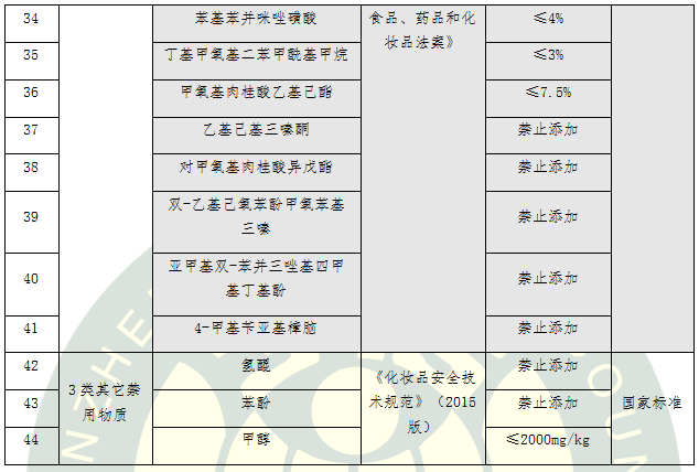 表4.15類化學(xué)防曬劑標(biāo)準(zhǔn)要求比對及評價結(jié)果