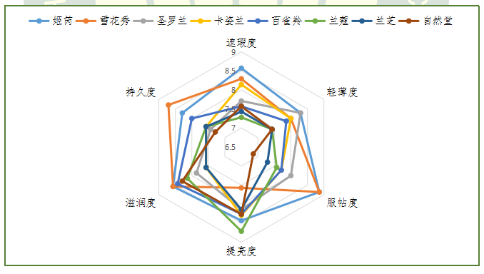 獲得本次感官評價指標(biāo)綜合得分前三名的品牌為:姬芮、雪花秀和圣羅蘭,得分分別為:8.44、8.22和7.91。8款產(chǎn)品在感官評價中均達到優(yōu)良水平以上。