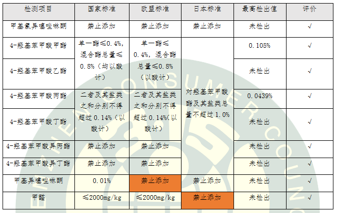 表3.不同國家地區(qū)防腐劑標(biāo)準(zhǔn)要求比對及評價結(jié)果