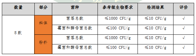 檢測結(jié)果顯示:8款氣墊粉底的粉撲和料體的菌落總數(shù)、霉菌和酵母菌總數(shù)檢出量均低于10 CFU/g,遠低于產(chǎn)品微生物的標(biāo)準(zhǔn)要求限值,屬于安全范圍,消費者無需過度擔(dān)心。