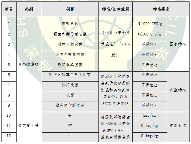 本次比較試驗檢測項目廣泛征求了企業(yè)、業(yè)內(nèi)專家和第三方檢測機構(gòu)的意見,不僅依據(jù)了現(xiàn)行國家標(biāo)準(zhǔn),而且在國標(biāo)基礎(chǔ)上結(jié)合嚴(yán)格的歐盟標(biāo)準(zhǔn) 《歐盟化妝品法規(guī)EC1223/2009及其相關(guān)修訂文件》、《歐盟消費者安全科學(xué)委員會(SCCS)關(guān)于化妝品安全的第九版指南》、德國聯(lián)邦消費者保護和食品安全局(BVL)關(guān)于可避免雜質(zhì)重金屬限值的調(diào)查報告、美國《聯(lián)邦食品、藥品和化妝品法案》、日本厚生勞動省《藥事法》以及其它相關(guān)標(biāo)準(zhǔn)、法規(guī)和技術(shù)文件的要求,采用國家標(biāo)準(zhǔn)檢測方法、實驗室通用方法等手段進行檢測,從44項指標(biāo)展開氣墊粉底安全性品質(zhì)大比拼,詳細項目與要求見表1。