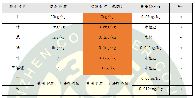 由于配方用料的特殊性,粉底類產(chǎn)品要比普通的面霜和乳液更容易受到重金屬的污染。因此,本次比較試驗不僅檢測國標(biāo)要求的鉛、砷、汞、鎘,歐盟額外要求的銻和可溶鎳,還檢測了我國和歐盟均禁用的鉻和釹,并且,6種有限量要求的重金屬均按照最嚴(yán)格的德國標(biāo)準(zhǔn)進行評價。