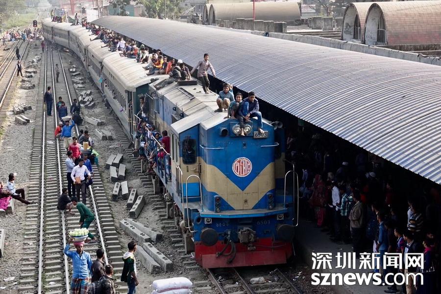 從達(dá)卡到邁門辛的火車是國(guó)內(nèi)最擁擠的線路之一,通常有數(shù)千名旅客擠在載客人數(shù)只有650人的火車?yán)?,有的抓著把手,有的蹲在門口,要不就蹲在車箱間的聯(lián)軸上或坐在車頂上。李仁奇攝