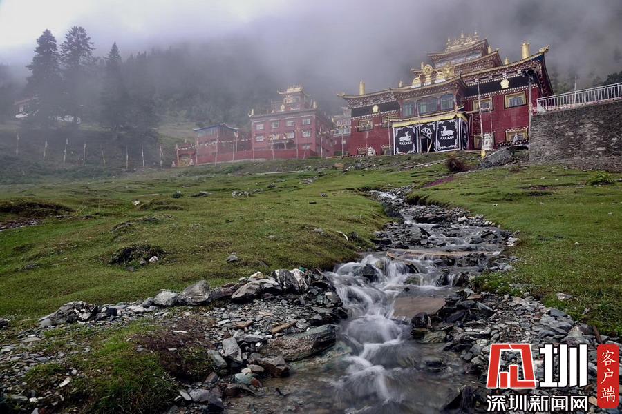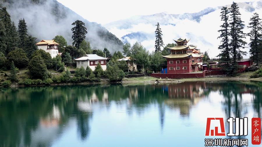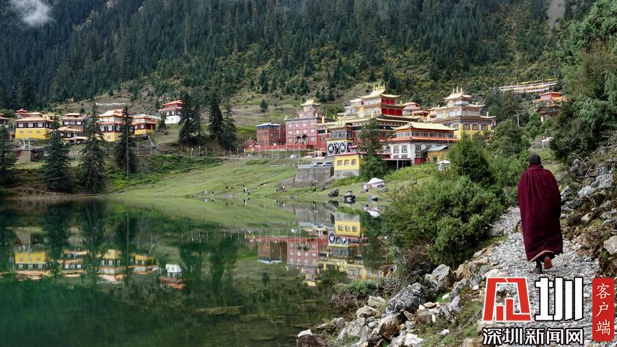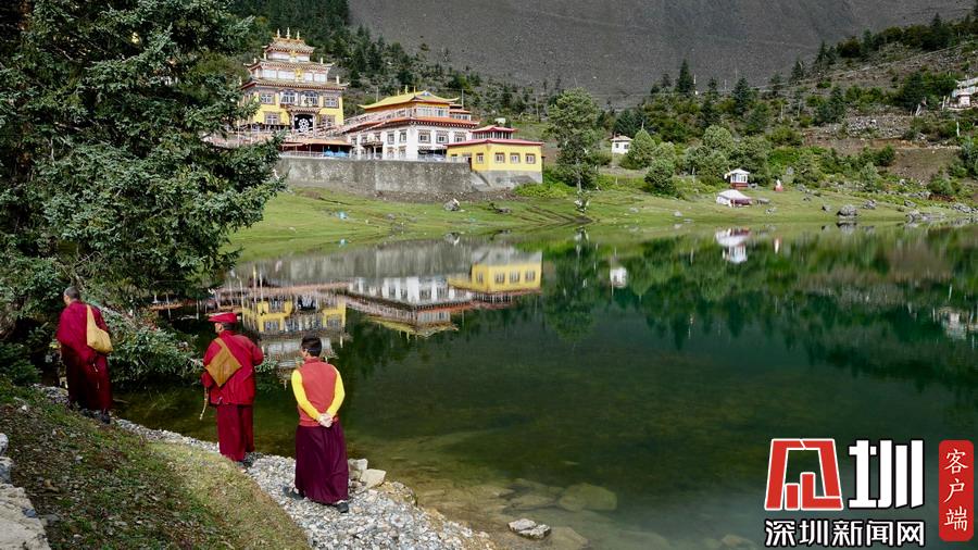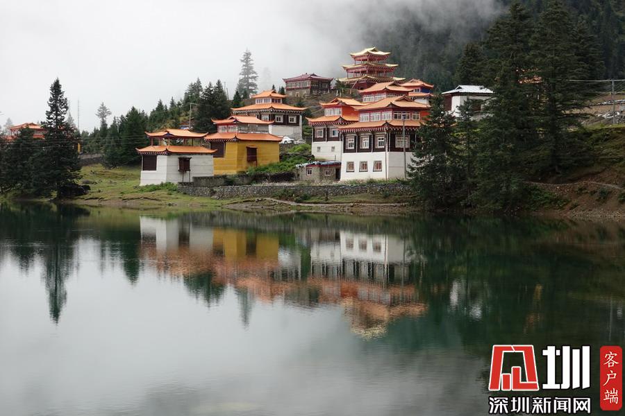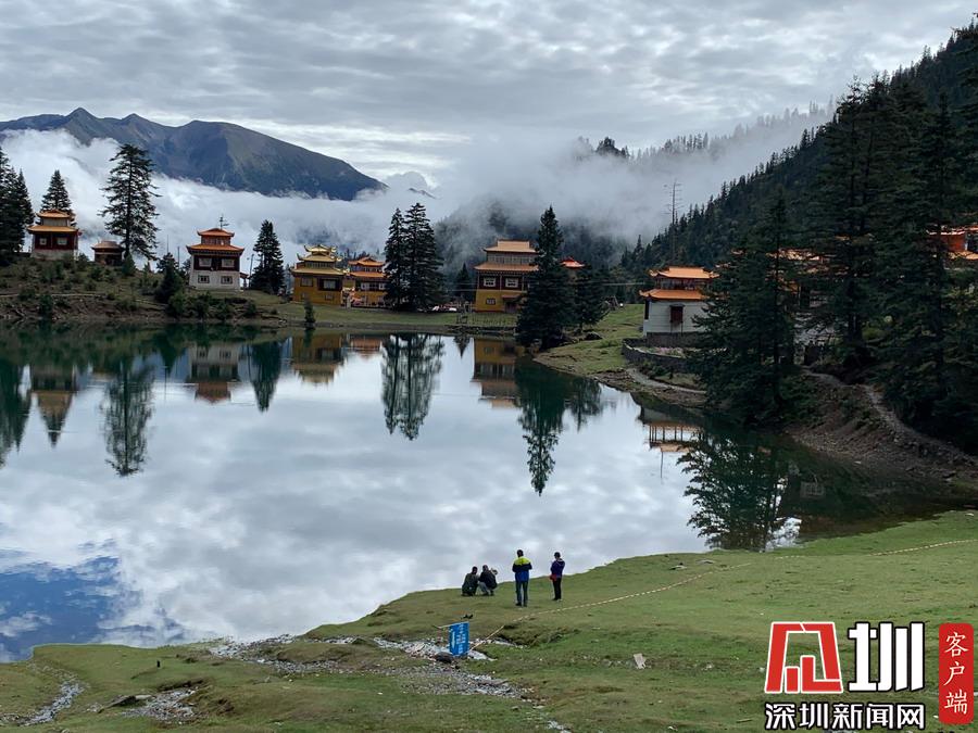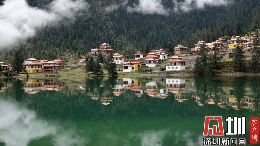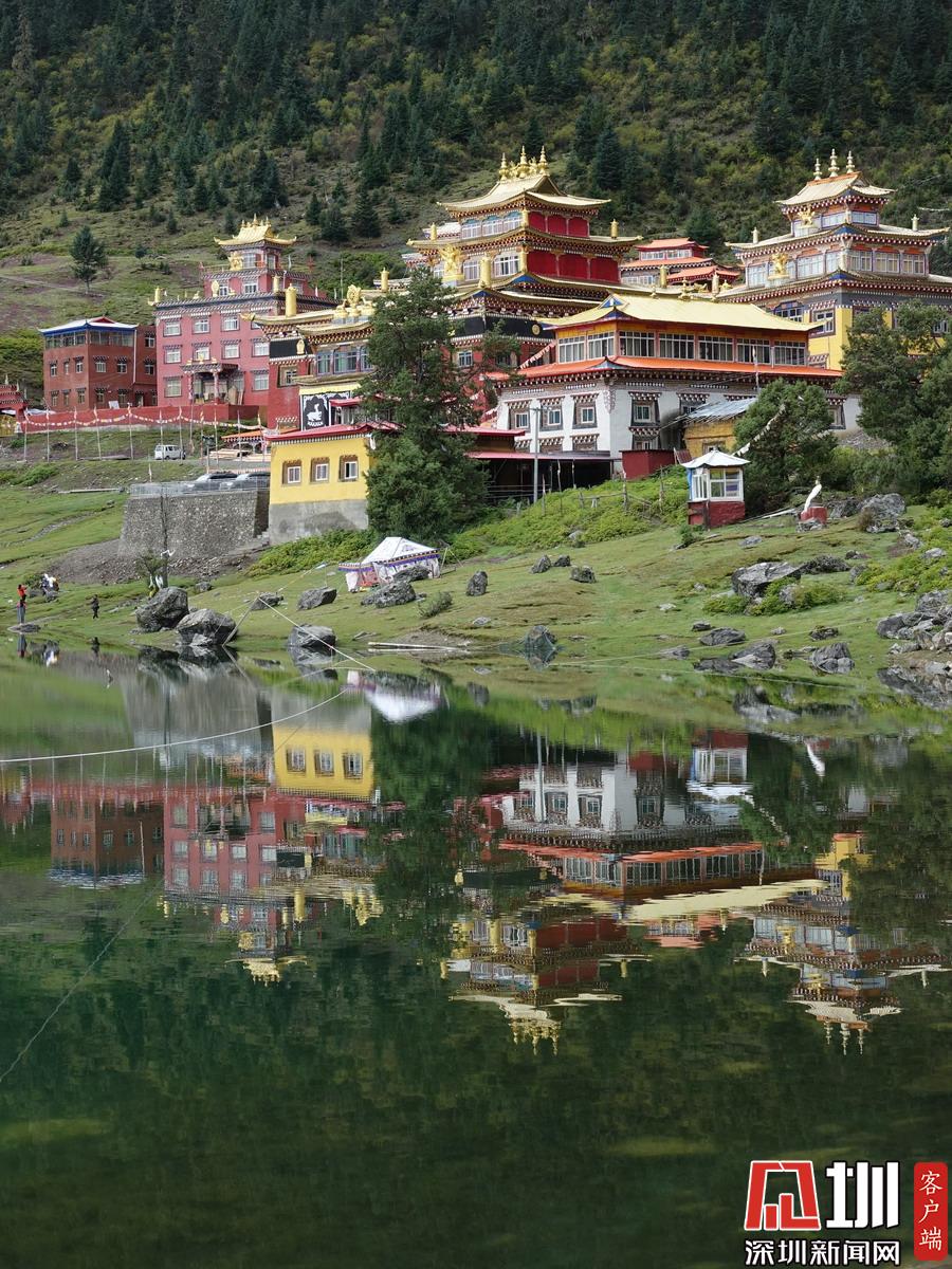湖的四周是森林和由措卡寺寺僧主持修建的藏傳佛教各色建筑,它們時(shí)而云遮霧障,時(shí)而與藍(lán)天白云一起倒映在湖中。李仁奇攝