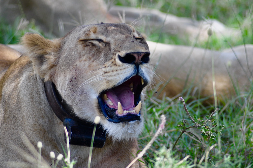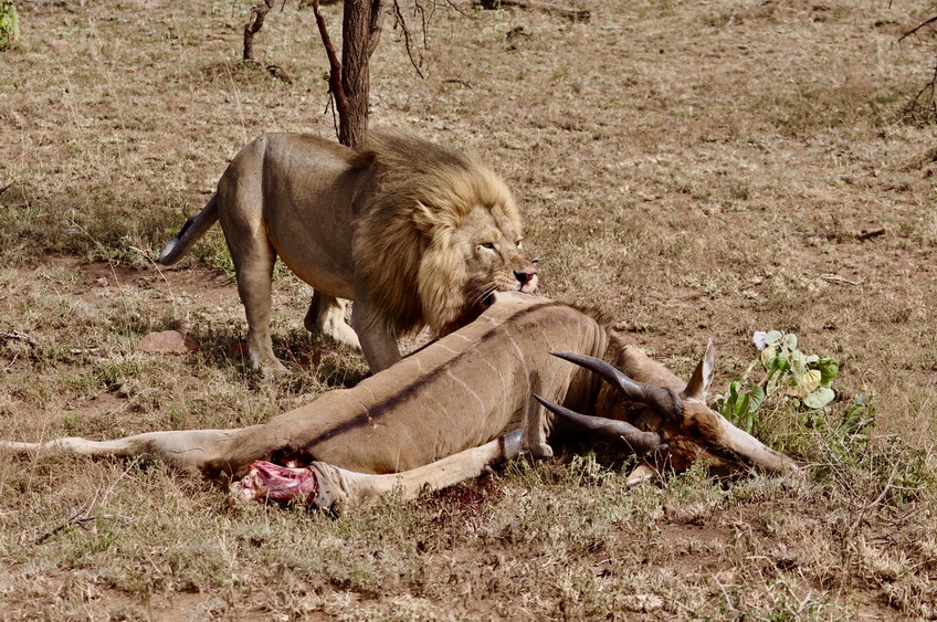 作者運(yùn)氣不錯(cuò),在塞倫蓋蒂巡游時(shí)巧遇一頭雄獅守護(hù)在一頭被咬死的大羚羊旁。李仁奇 攝