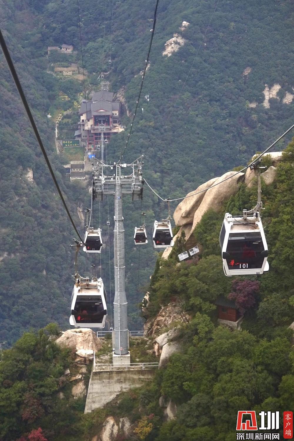 索道設(shè)備由法國波馬公司制造,整體安全與運(yùn)營系統(tǒng)采用最尖端的客運(yùn)索道技術(shù)。華山索道一覽。李仁奇攝。