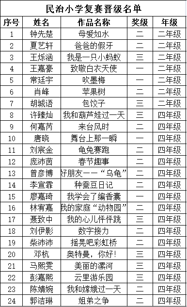 自2021年1月,活動(dòng)征稿啟動(dòng)以來(lái),獲得了深圳市廣大中小學(xué)生、教師、文學(xué)愛(ài)好者的熱烈響應(yīng)積極參與,吸引了深圳百余所學(xué)校的上萬(wàn)人關(guān)注報(bào)名。現(xiàn)公布龍華區(qū)民治小學(xué)晉級(jí)復(fù)賽名單如下: