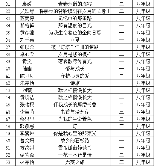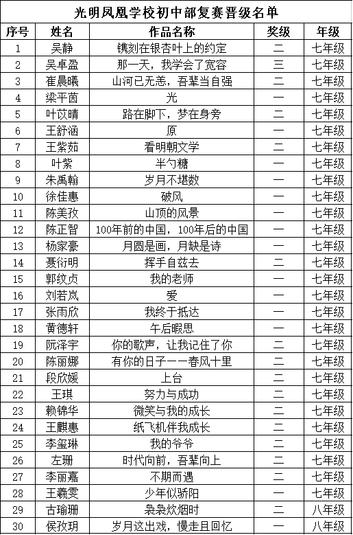 自2021年1月,活動征稿啟動以來,獲得了深圳市廣大中小學生、教師、文學愛好者的熱烈響應積極參與,吸引了深圳百余所學校的上萬人關(guān)注報名。現(xiàn)公布光明區(qū)鳳凰學校晉級復賽名單如下: