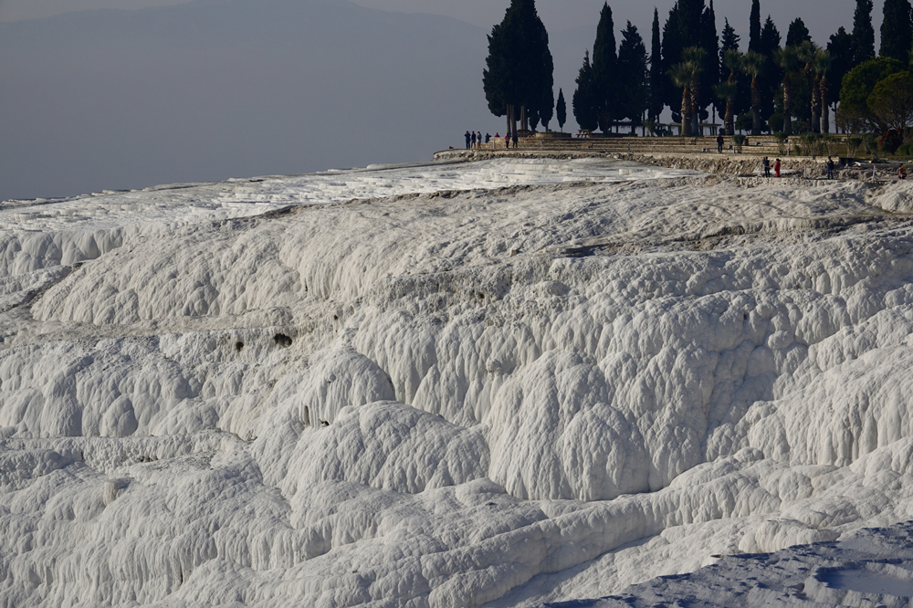 終年維持?jǐn)z氏29度的溫泉水在山崖上經(jīng)過億萬年流動,其中的礦物質(zhì)沉淀下來,把整個山坡染成白色的露天溶巖,遠(yuǎn)看形似堆積如山的棉花,一腳踩上去,才知道是堅(jiān)硬的白色石灰?guī)r。由于一層又一層的巖石形狀很像城堡,故得名棉花堡。李仁奇 攝