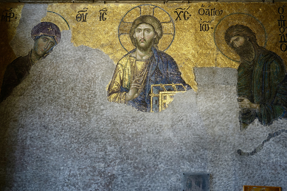 馬賽克《三圣像》,畫面下方已經被嚴重損毀,但仍然能看到中央的耶穌基督,其兩側是圣母瑪利亞和施洗者約翰。李仁奇 攝