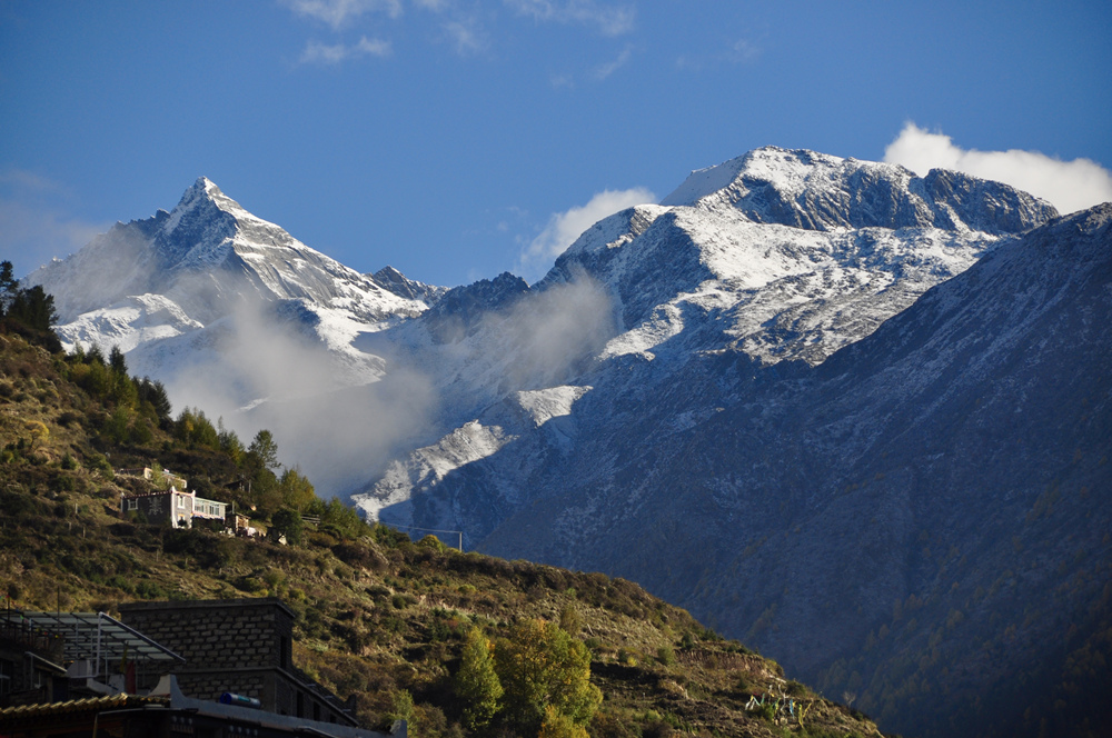 如果天氣晴好,在四姑娘山鎮(zhèn)旁山坡上的觀景臺可以眺望到同框的四座雪峰。李仁奇 攝