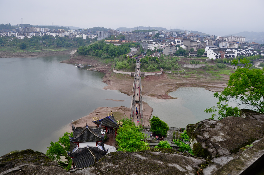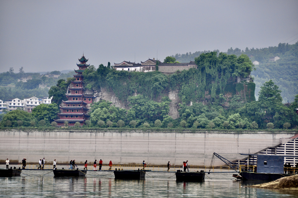 三峽庫(kù)區(qū)蓄水后,石寶寨被一道水泥圍堰保護(hù)起來(lái),成為孤島,與江岸的聯(lián)系全憑一座吊橋,又被比喻為“世界最大的盆景”、“永不沉沒(méi)的航空母艦”。李仁奇 攝