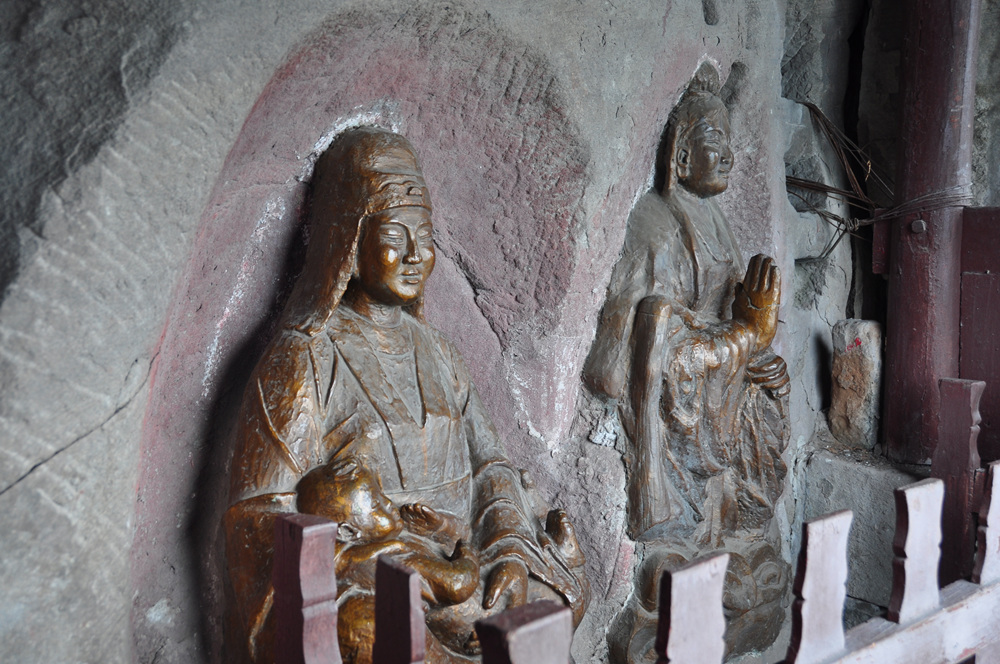 山頂有古剎天子殿,創(chuàng)建于康熙、乾隆年間,是此寨最高點(diǎn)。正殿墻壁有女?huà)z補(bǔ)天故事的壁畫(huà),畫(huà)下方,有一遺石,似石寶寨。李仁奇 攝
