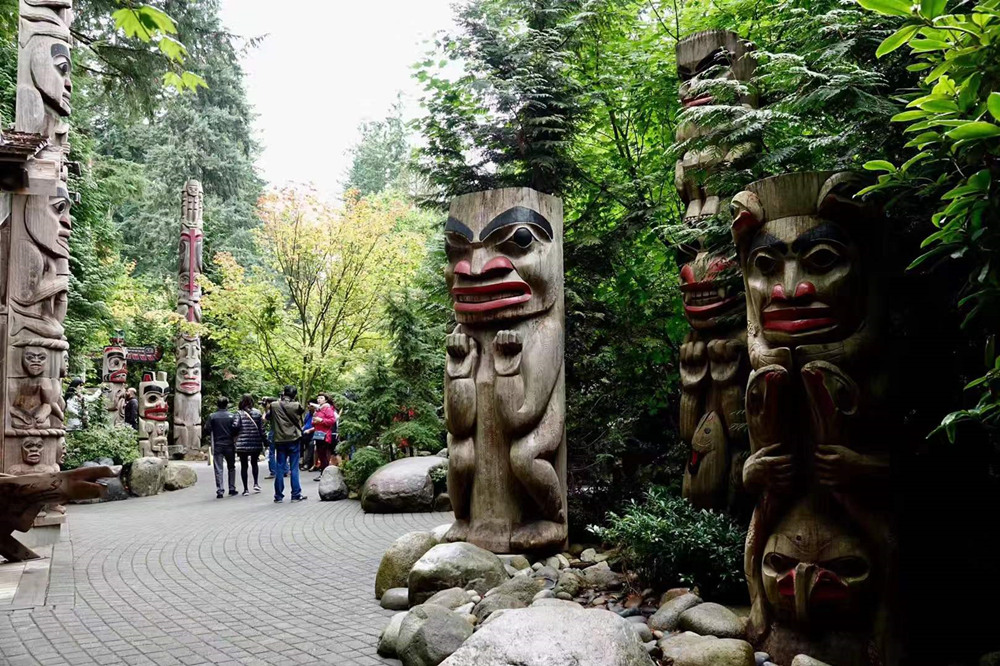 吊橋公園中,有幾十年前印第安人所雕刻且置放于此的圖騰柱,色彩鮮艷、引人注目。李仁奇 攝