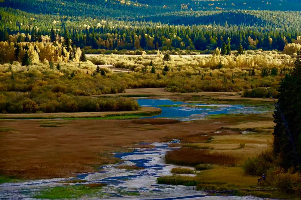 班夫朱砂湖也叫微米里翁湖,是位于園內(nèi)的一片濕地群,其中國(guó)式名稱(chēng)可能是因?yàn)楹嫔嫌写笃募t色水草。李仁奇 攝