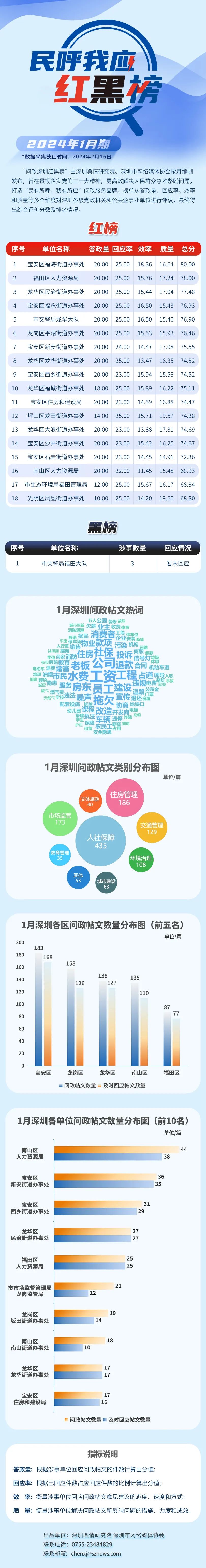 據(jù)悉,本期榜單采集的帖文主要來自深圳論壇、深圳各區(qū)政府官網(wǎng)、人民網(wǎng)領(lǐng)導(dǎo)留言板等平臺(tái),所采集帖文發(fā)布時(shí)間為2024年1月1日至1月31日。