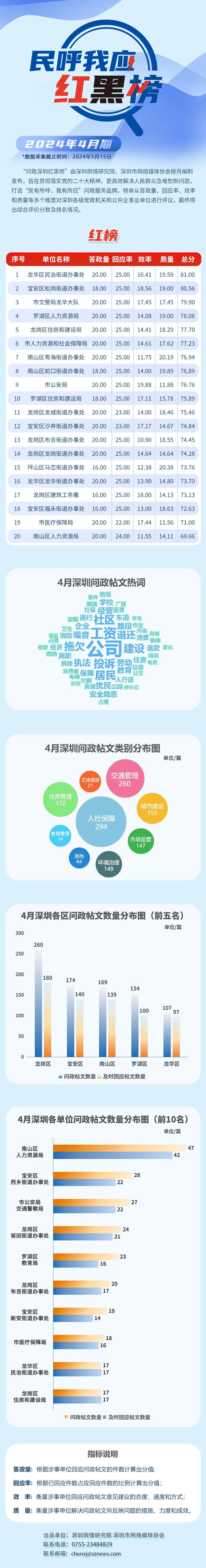 2024年4月,共有20家單位因積極解決民生問題,認(rèn)真細(xì)致答政,最終登上“紅榜”,它們分別是:龍華區(qū)民治街道辦事處、寶安區(qū)松崗街道辦事處、市交警局龍華大隊(duì)、羅湖區(qū)人力資源局、龍崗區(qū)住房和建設(shè)局、市人力資源和社會(huì)保障局、南山區(qū)粵海街道辦事處、南山區(qū)蛇口街道辦事處、市公安局、羅湖區(qū)住房和建設(shè)局、龍崗區(qū)龍城街道辦事處、寶安區(qū)沙井街道辦事處、龍崗區(qū)布吉街道辦事處、龍崗區(qū)龍崗街道辦事處、坪山區(qū)馬巒街道辦事處、龍華區(qū)龍華街道辦事處、龍崗區(qū)建筑工務(wù)署、寶安區(qū)福永街道辦事處、市醫(yī)療保障局、南山區(qū)人力資源局。
