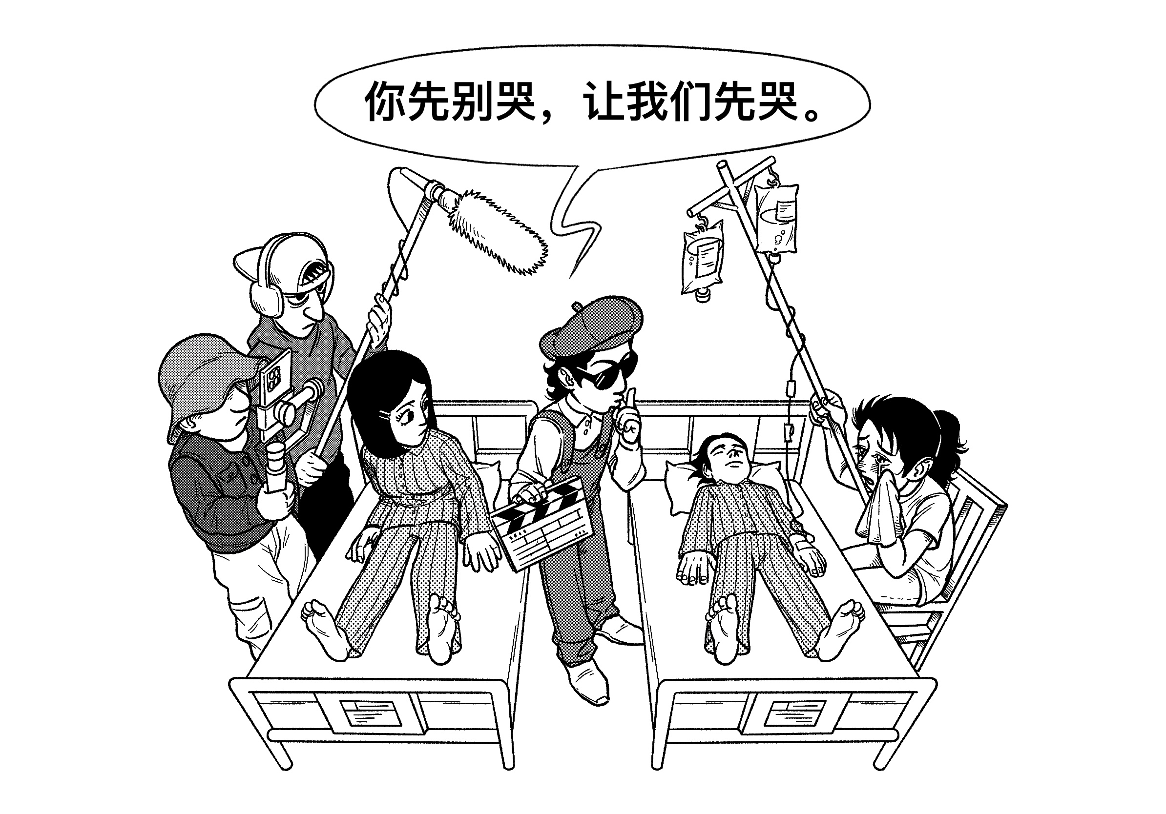 近日,某劇組在一家醫(yī)院ICU病房外拍攝短劇,竟讓患者家屬“哭小點聲”。迫使“真情”讓步“劇情”,這事里面多少有點“病情”。