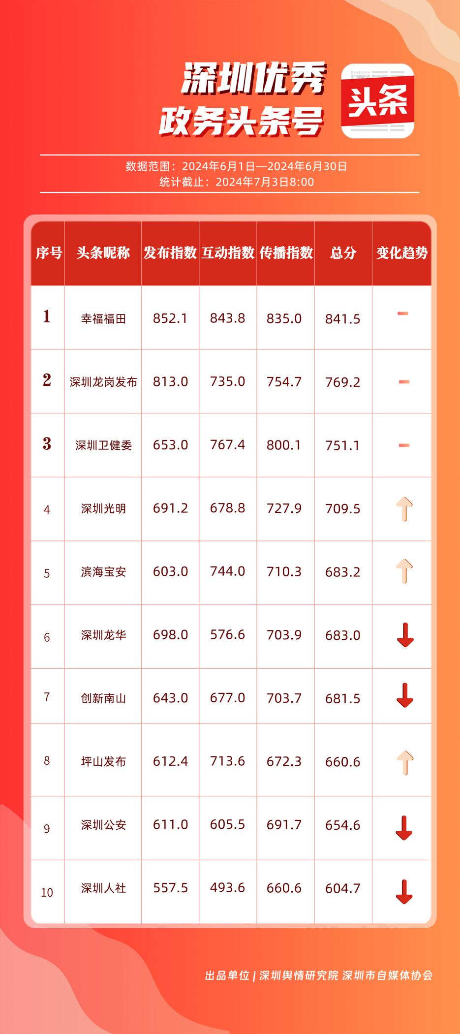 6月,“幸福福田”“深圳龍崗發(fā)布”“深圳衛(wèi)健委”“深圳光明”“濱海寶安”“深圳龍華”“創(chuàng)新南山”“坪山發(fā)布”“深圳公安”“深圳人社”共10個(gè)政務(wù)頭條號(hào)能夠及時(shí)發(fā)布政務(wù)信息及公共服務(wù)信息,入列“優(yōu)秀政務(wù)頭條號(hào)”榜單。從數(shù)據(jù)上分析,《“深圳120”被同一手機(jī)號(hào)連呼14次,真相是……》《多家銀行宣布:下調(diào)存款利率!》《下一站,寶安!》等優(yōu)秀文章為網(wǎng)民提供醫(yī)療急救、經(jīng)濟(jì)政策、區(qū)域發(fā)展等領(lǐng)域的信息,發(fā)揮各自賬號(hào)在信息傳播、公共服務(wù)等方面的重要功能,收獲較高點(diǎn)贊。