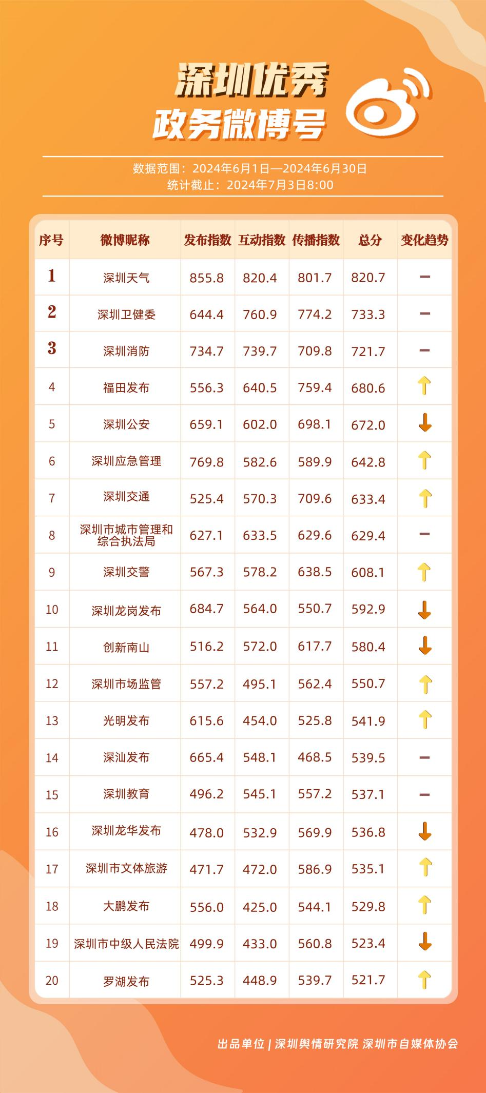 6月,“深圳天氣”“深圳衛(wèi)健委”“深圳消防”“福田發(fā)布”“深圳公安”“深圳應(yīng)急管理”“深圳交通”“深圳市城市管理和綜合執(zhí)法局”“深圳交警”“深圳龍崗發(fā)布”等20個(gè)政務(wù)微博號(hào)入列“優(yōu)秀”名單?!吧钲谔鞖狻薄吧钲谛l(wèi)健委”“深圳消防”等賬號(hào)抓住微博平臺(tái)的傳播特征,持續(xù)輸出優(yōu)質(zhì)內(nèi)容,滿足受眾需求,不斷提高用戶體驗(yàn)和傳播效果。
